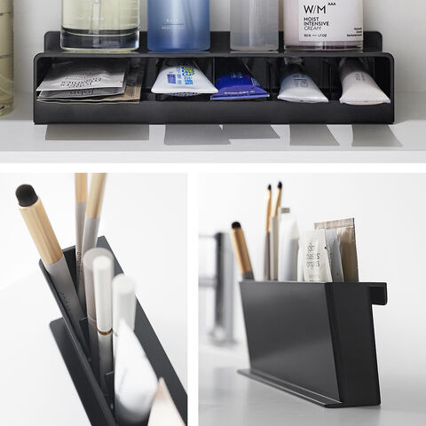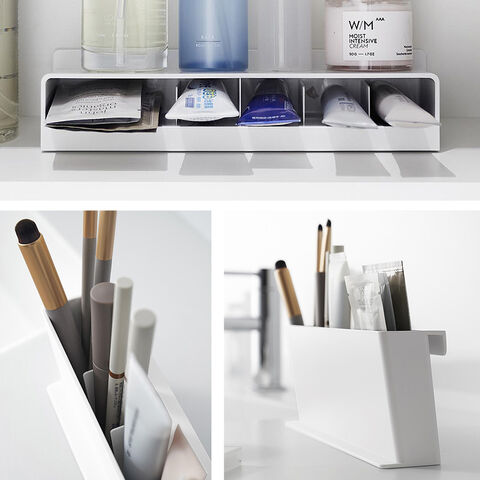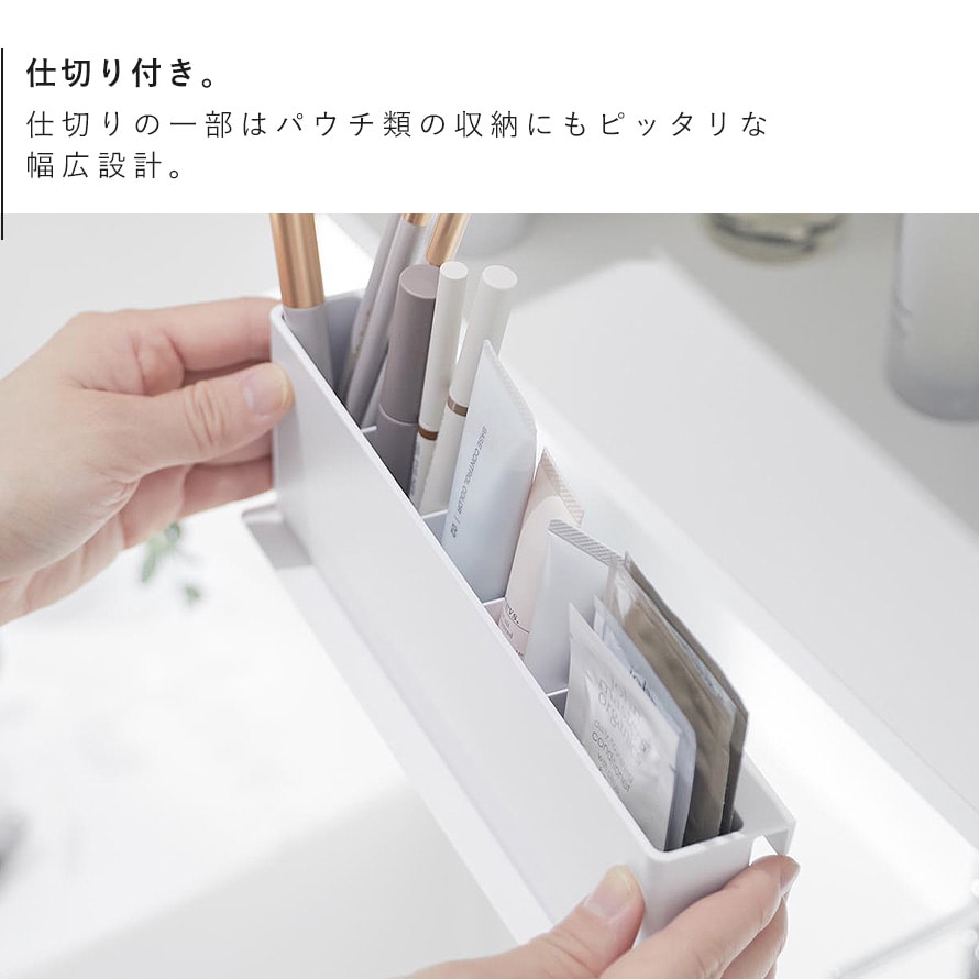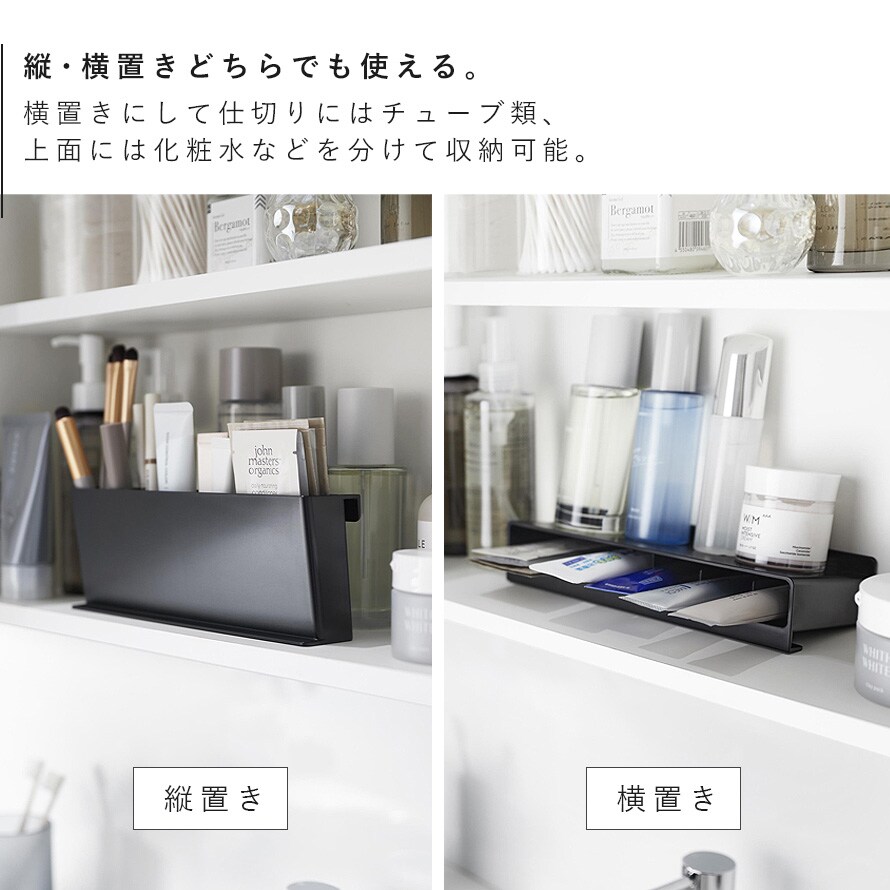 横置きにすれば、仕切り部分にチューブ類を、上面には化粧水などを分けて収納可能。