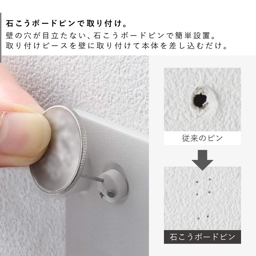 壁の穴が目立ちにくい石こうボードピンで部屋の壁に取り付け可能。付属の木ネジでも取り付け可能です。