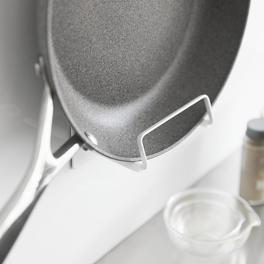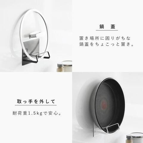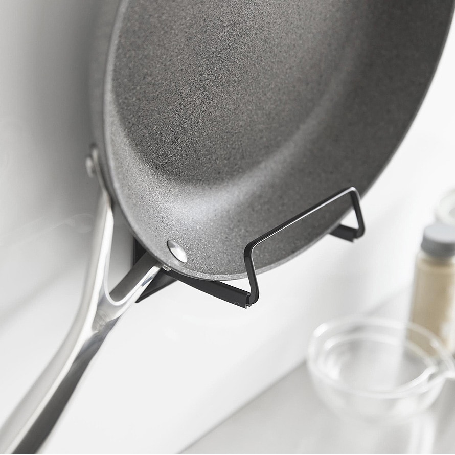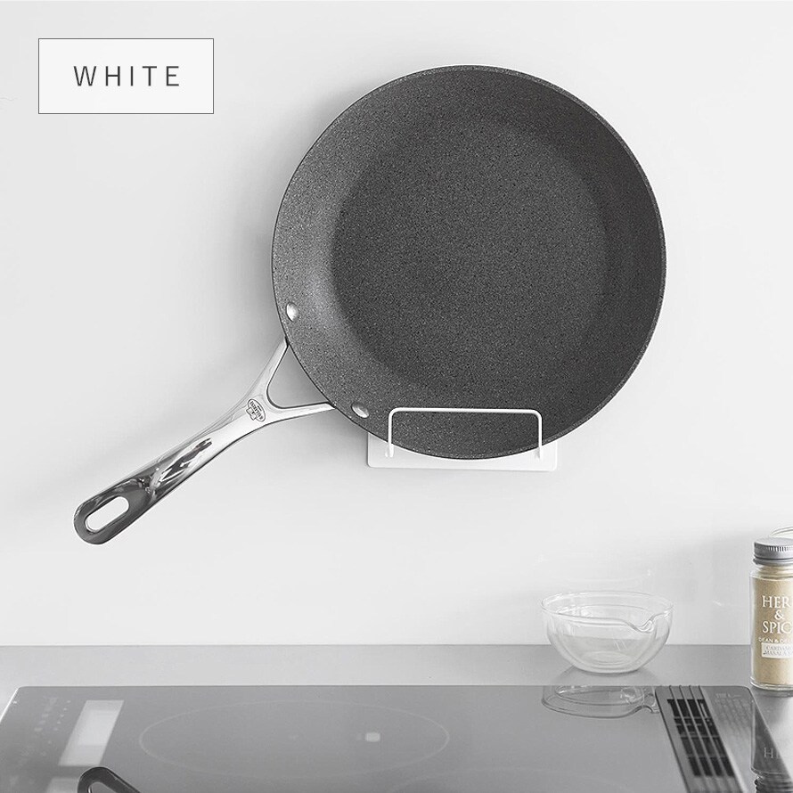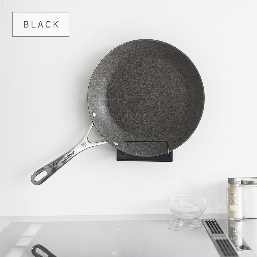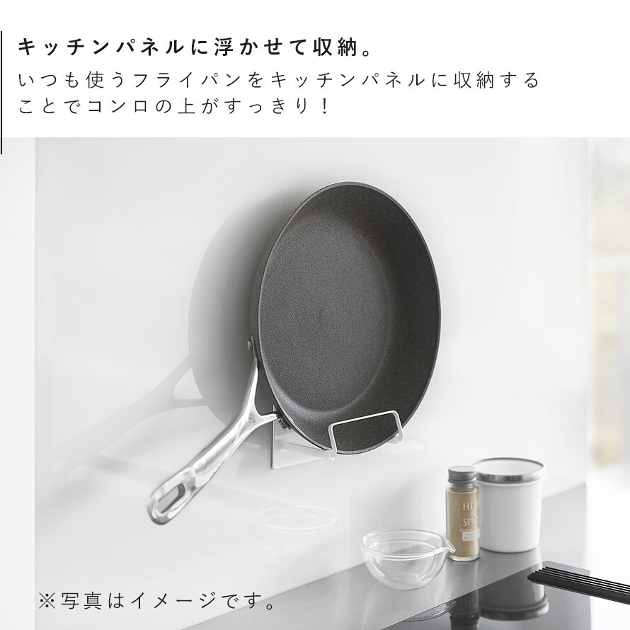 マグネットがつくキッチンパネルに浮かせて収納できる、フライパンホルダーです。