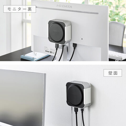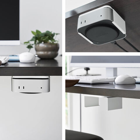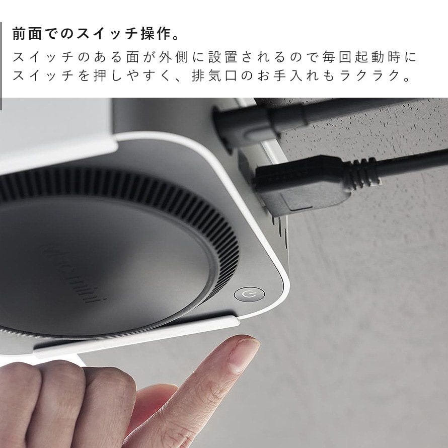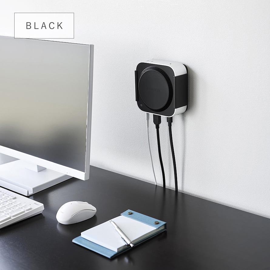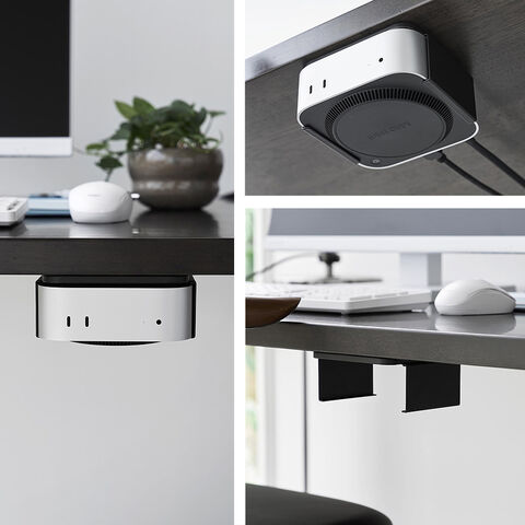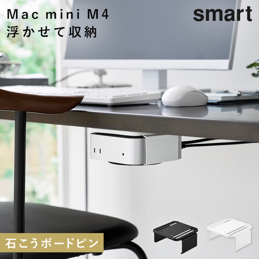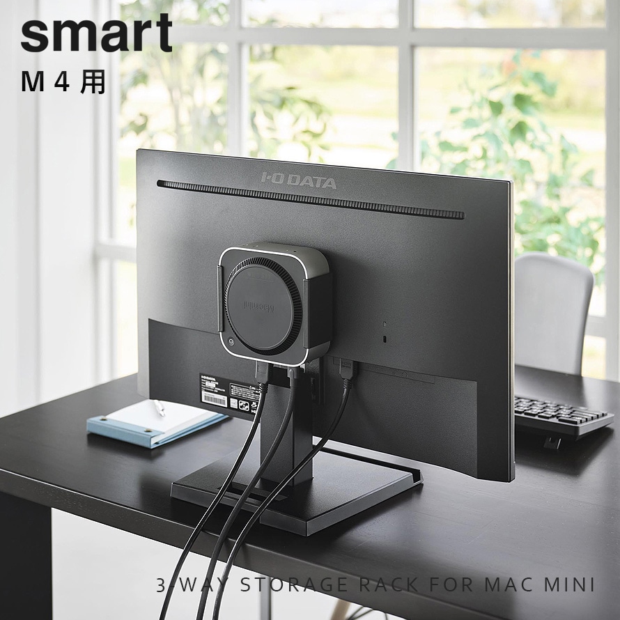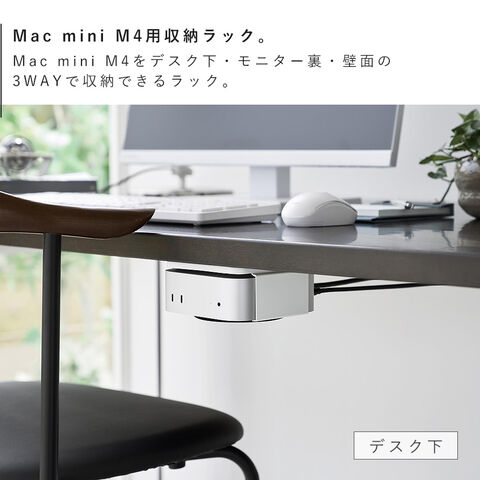 Mac mini M4を、モニター背面・デスク下・壁面の3通りで収納できるラックです。
