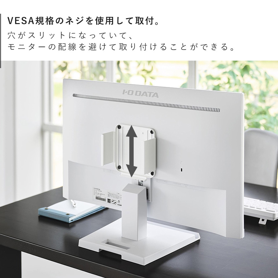 モニター背面のVESA規格ネジ穴に対応し、スリット穴によりモニターの支柱や配線を避けて取り付けることができます。