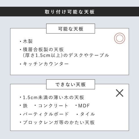 | 取り付け可能な場所 | ■取り付け可能な天板 木製・積層合板製の天板(厚さ1.5cm以上)のデスクやテーブル、キッチンカウンター ■取り付け可能なパソコンモニター モニター背面VESA規格対応ネジ穴のピッチ/縦10cm以内×横7.5・10cm ■取り付け可能な壁 石こうボードピン使用時/壁紙・布壁紙・ビニール壁紙貼りなどの石こうボード、薄ベニヤ 木ネジ使用時/柱・板壁(厚さ1cm以上)・プリント合板(裏側に水平にサンがある場所)・裏側に下地材(間柱)が入っている壁 ※小型PCは付属しておりません。 |