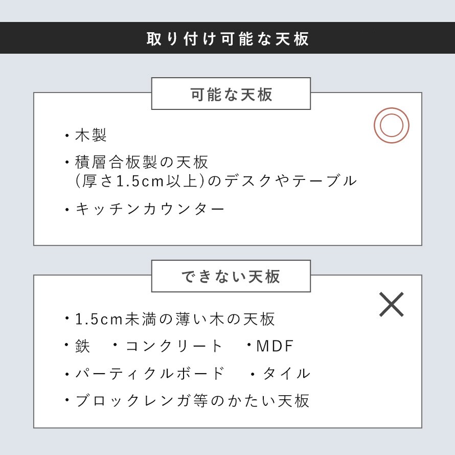 | 取り付け可能な天板 | 木製・積層合板製の天板(厚さ1.5cm 以上)のデスクやテーブル、キッチンカウンター |