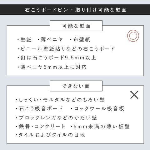 | 取り付け可能な壁 | 石こうボードピン使用時/壁紙・布壁紙・ビニール壁紙貼りなどの石こうボード、薄ベニヤ 木ネジ使用時/柱・板壁(厚さ1cm以上)・プリント合板(裏側に水平にサンがある場所)・裏に下地材(間柱)が入っている壁 ※充電機能はございません。 |