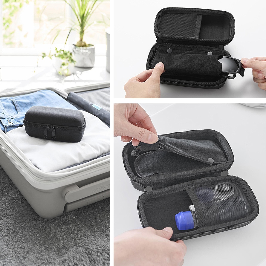 メガネやコンタクト用品をまとめてスッキリ収納できる、持ち運びに便利なケースです。