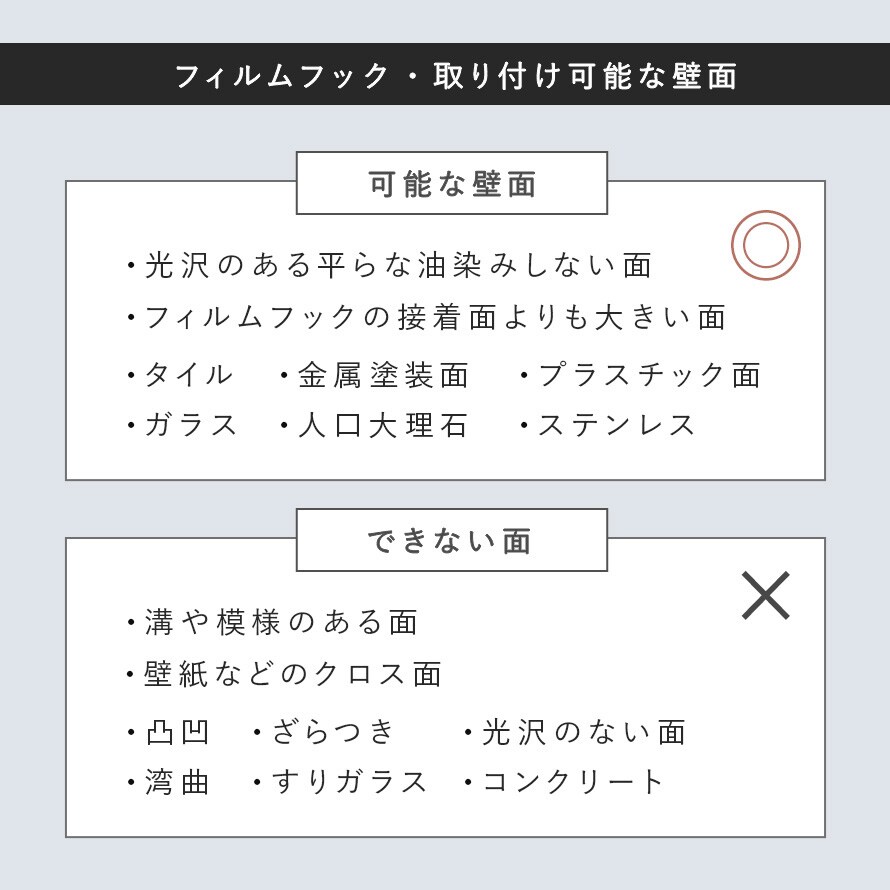 | 使用できる面 | 光沢のある平らな油染みしない面で、フィルムフックの接着面よりも大きい面(タイル・プラスチック・ステンレス・ガラス・鏡面(ミラー)・金属塗装面・人工大理石) ※表面加工・材質・状態などによっては貼り付けできない場合があります。 |