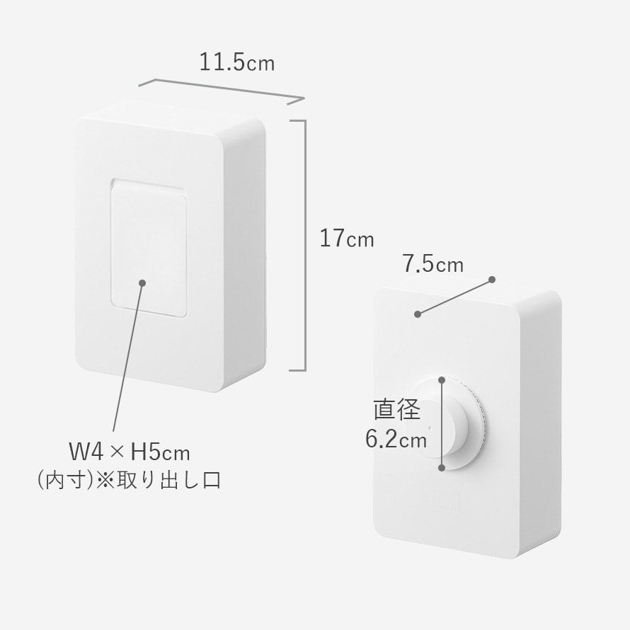 | 内寸サイズ | 本体/幅10.8×奥行4.2×高さ16.3cm 取り出し口/幅4×高さ5cm 取り付けベース/溝幅0.6cm・ネジ部直径2.2cm 固定キャップ/直径6.2×奥行1.9cm |
