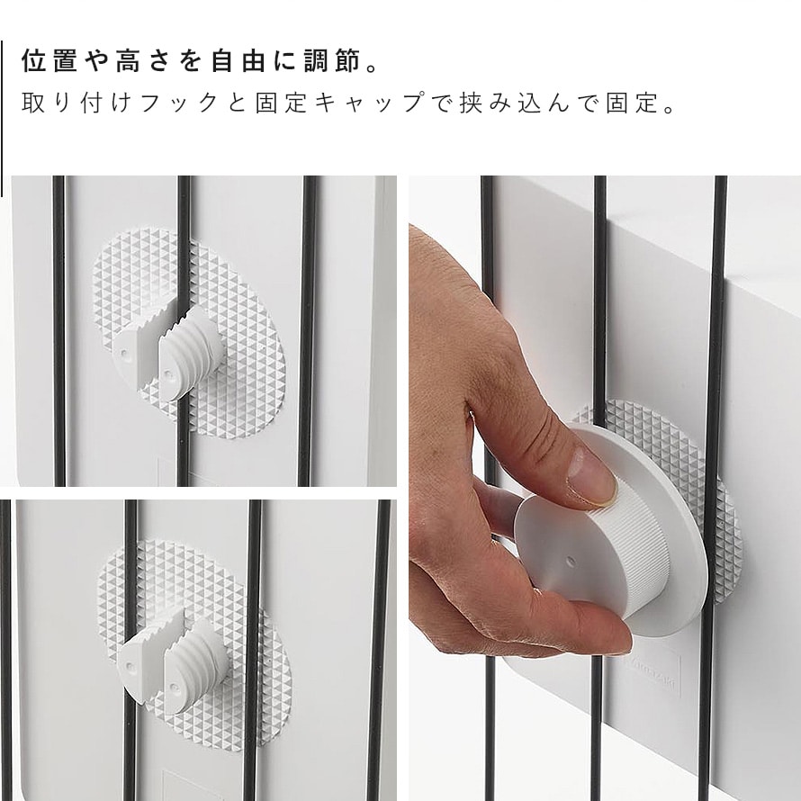 横向き・縦向きどちらの向きでも設置でき、柵を利用して取り付ける場所や高さを自由に調節できます。