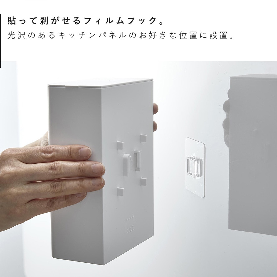フィルムフックでキッチンパネルやタイルに簡単に取り付けられるホルダーです。