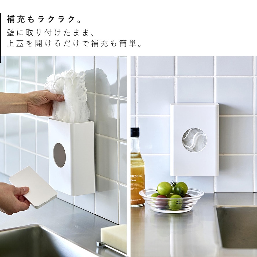 壁面に取り付けたまま蓋を開けるだけで簡単に補充できるのも便利。