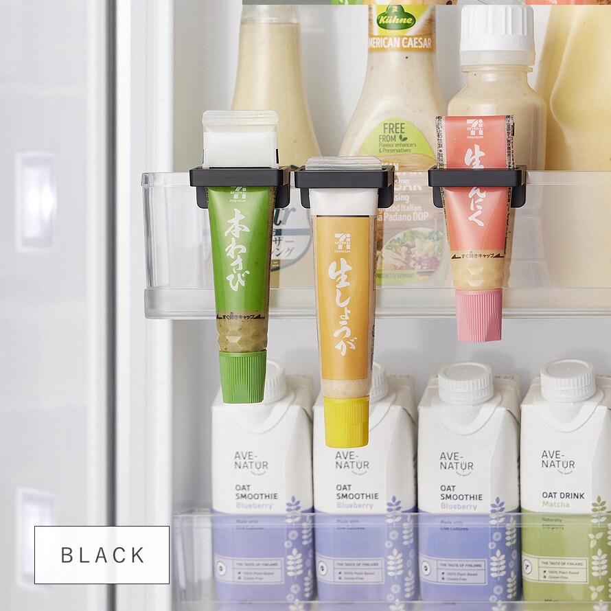 冷蔵庫のサイドポケットに引っ掛けて収納できる、絞れる薬味チューブホルダー3個組です。