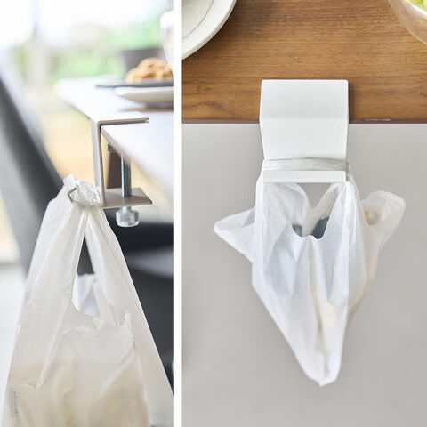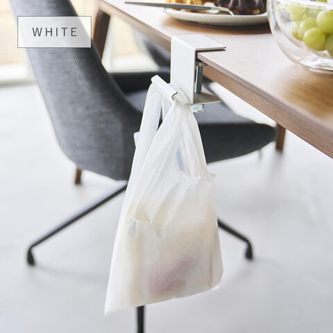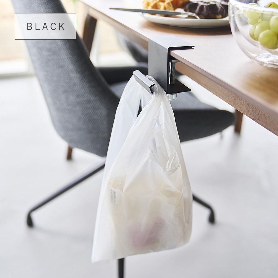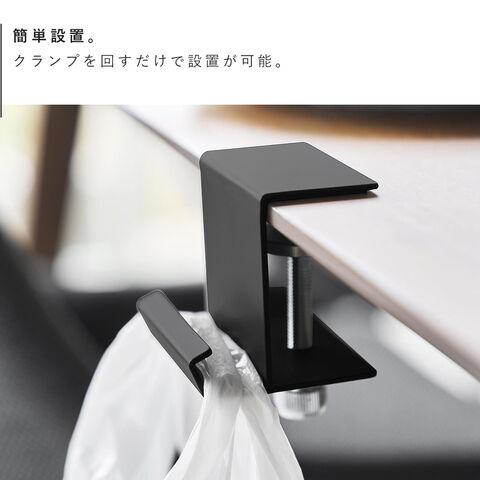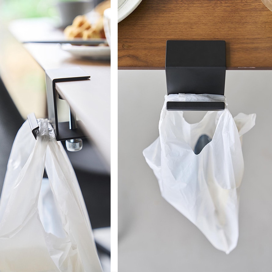 テーブル横にクランプ式でしっかり取り付けられるレジ袋ハンガー。