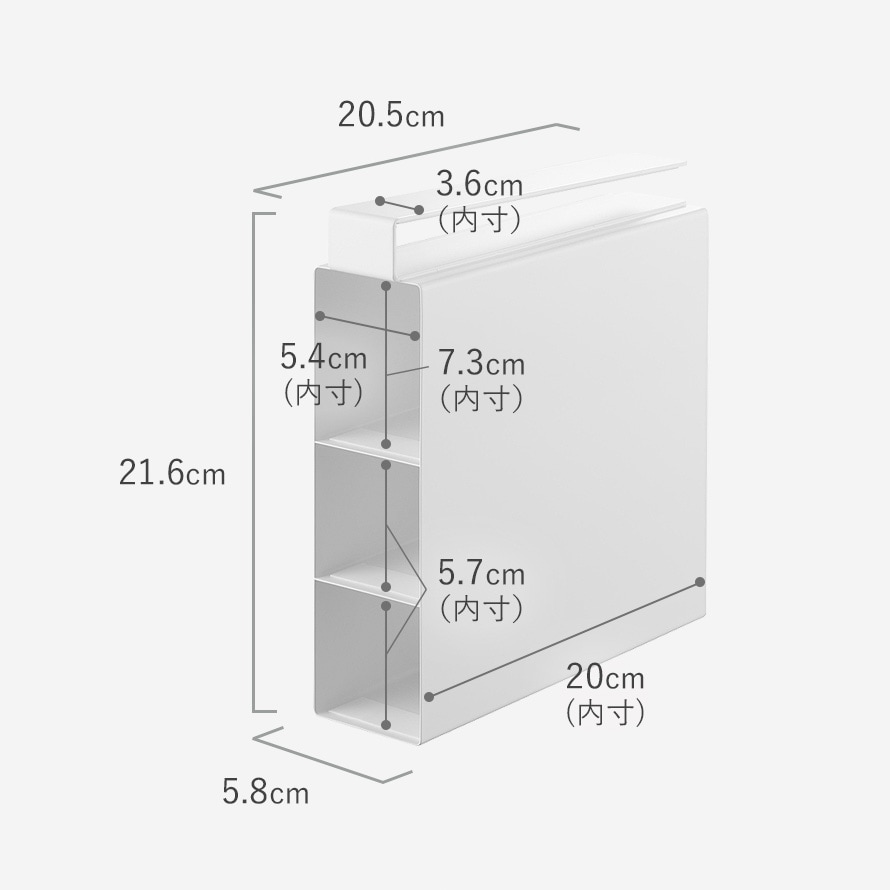 | 内寸サイズ | 収納部1段あたり/幅5.4×奥行20×高さ7.3(上段)・高さ5.7(中・下段)cm |