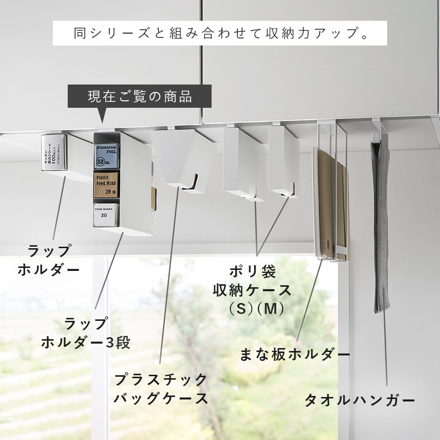 同シリーズの戸棚下ラップホルダー、戸棚下タオルホルダー、戸棚下まな板ホルダー、ポリ袋収納ケース(S・M)、プラスチックバッグケースなどもございます。