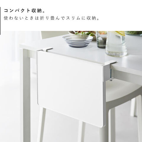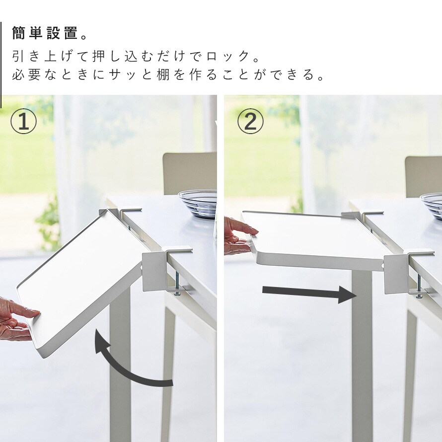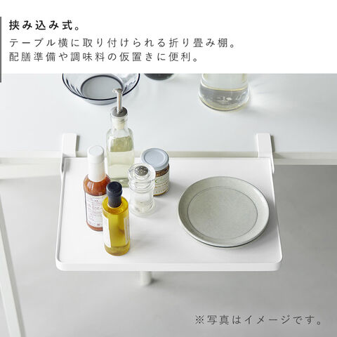 必要なときにサッと広げて使える、テーブル横に取り付けられる折り畳み棚です。