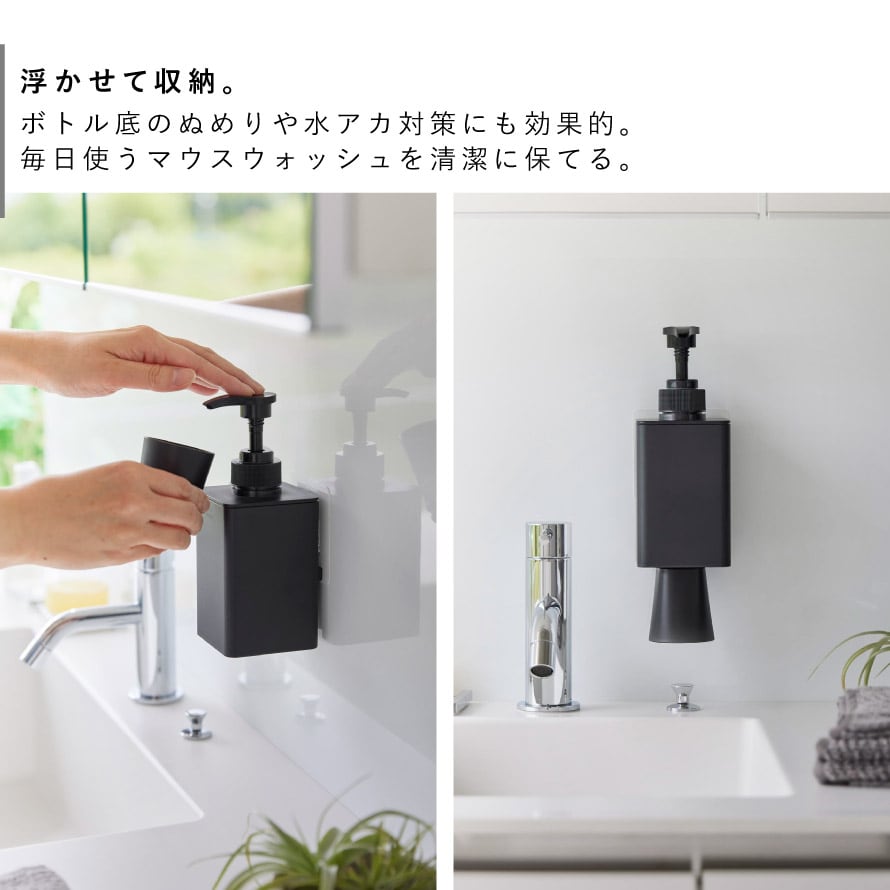 浮かせて収納できるので、ボトル底のぬめりや水アカ対策にも効果的。毎日使うマウスウォッシュを清潔に保てます。