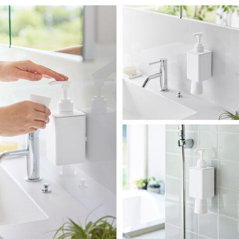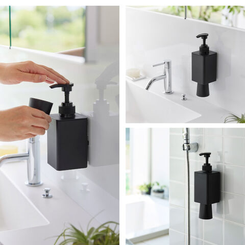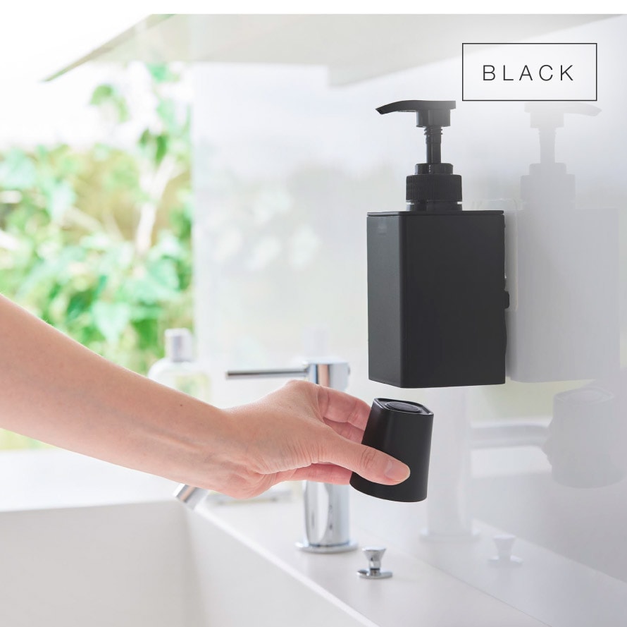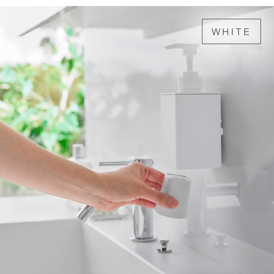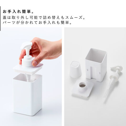 蓋は取り外し可能で詰め替えもスムーズ。パーツが分かれてお手入れも簡単。付属のタンブラーはディスペンサー底面にマグネットで収納でき、使用後もすっきりまとまる設計です。