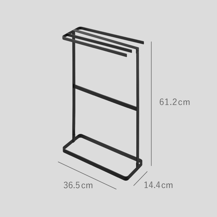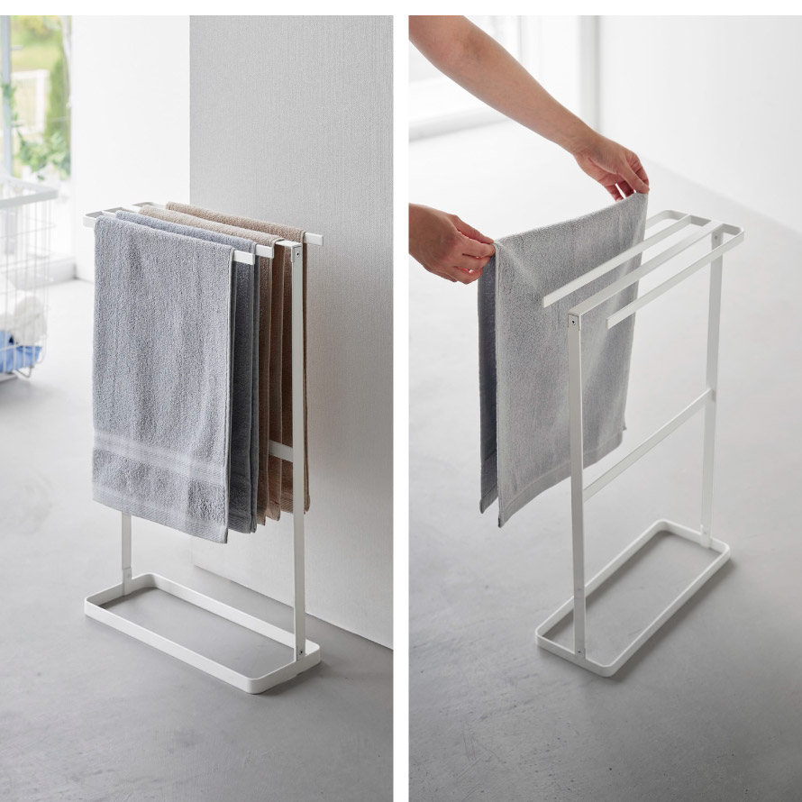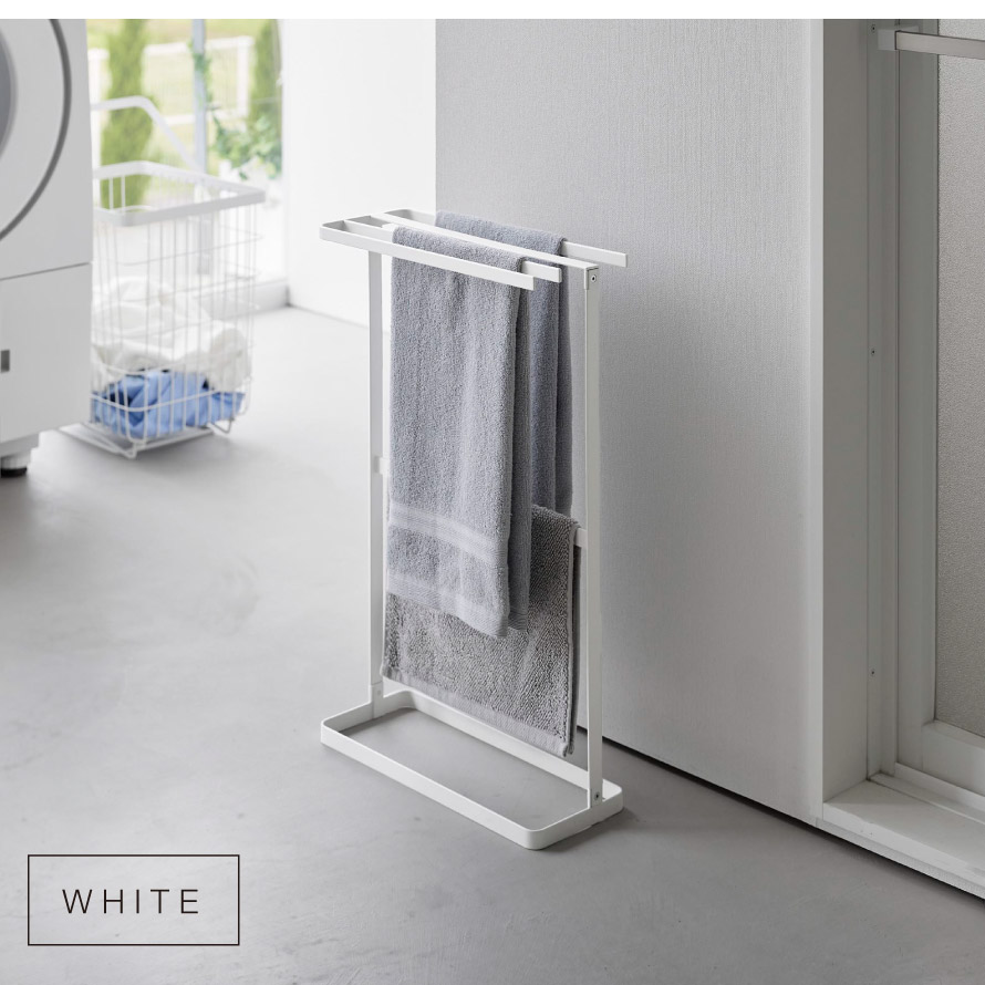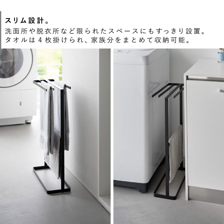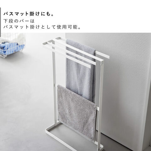 スリム設計で場所を取らず、洗面所や脱衣所などの限られたスペースにもすっきり設置できます。タオルは4枚掛けられ、家族分をまとめて収納可能。下段のバーはバスマット掛けとしても活躍します。