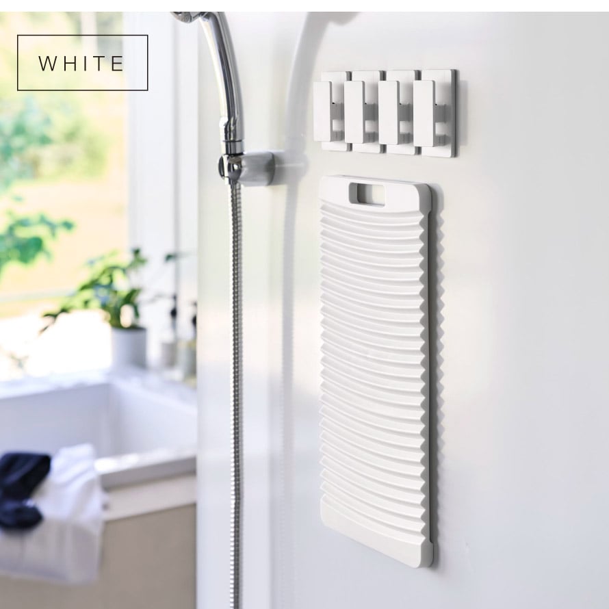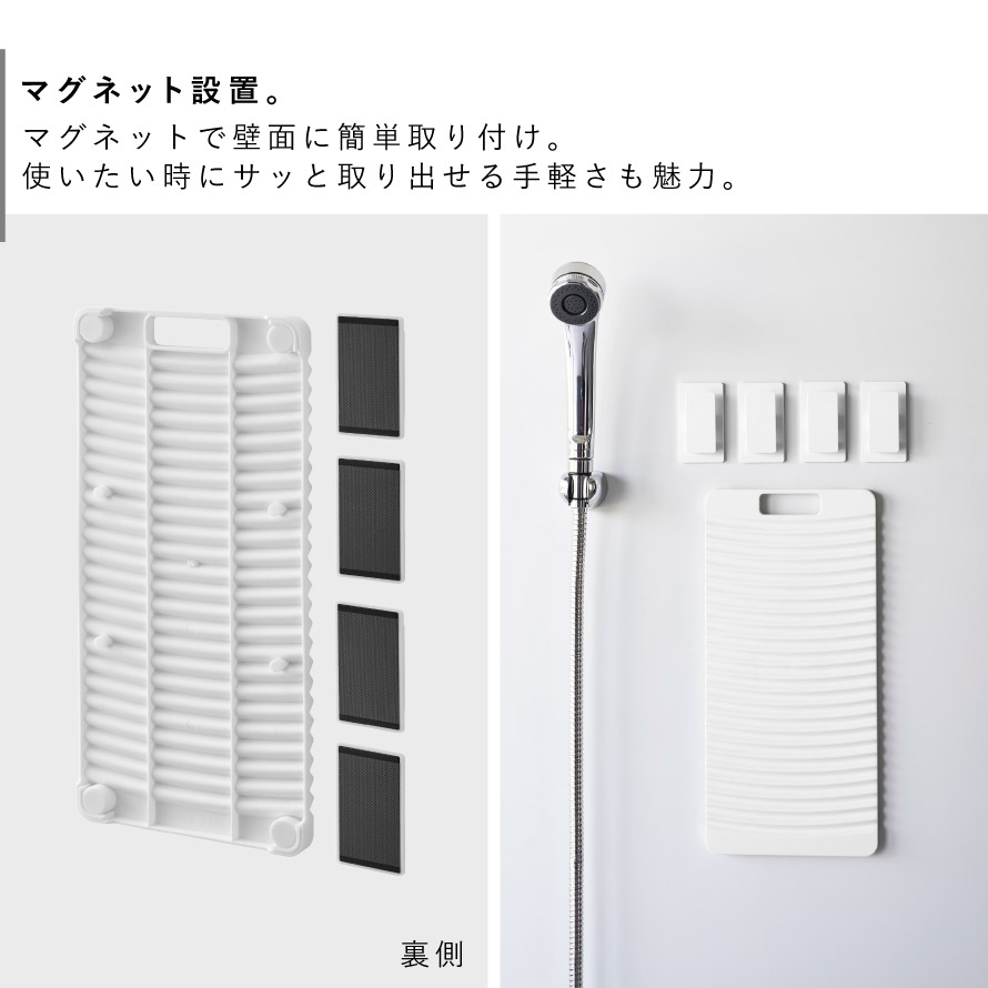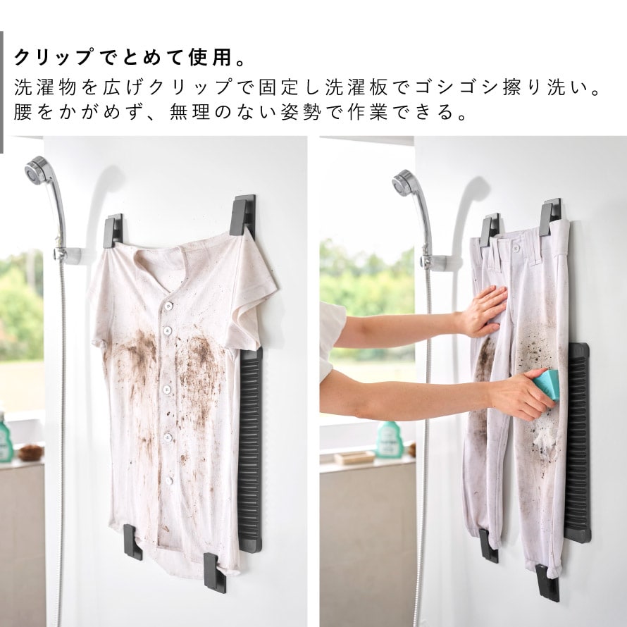 マグネットで壁面に簡単取り付け。使いたい時にサッと取り出せる手軽さも魅力。洗濯物を広げてクリップで固定し、そのまま洗濯板でゴシゴシ擦り洗い。腰をかがめず、無理のない姿勢で作業できるため、毎日の予洗いも快適に行えます。