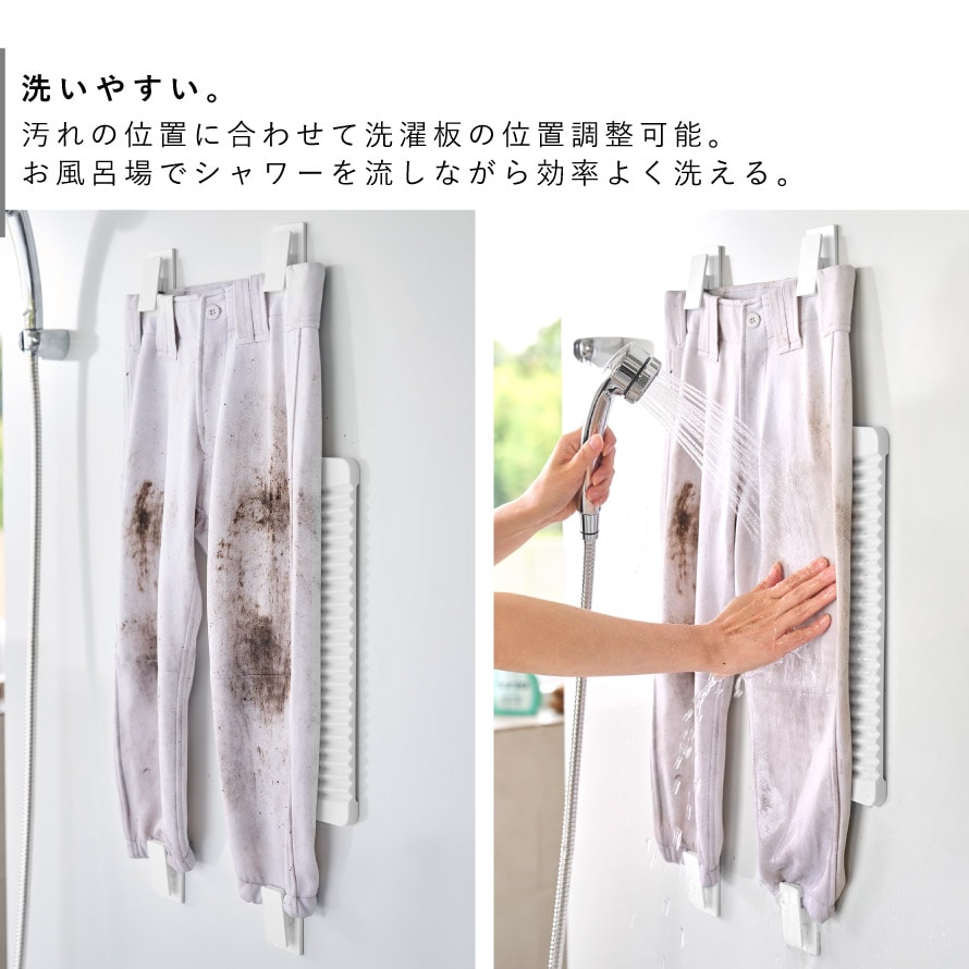 汚れの位置に合わせて洗濯板の位置を調整できるので、広い範囲の泥汚れにも対応。お風呂場でシャワーを流しながら効率よく洗えます。タワシを使えば衣類の前後を同時に洗うことができ、さらにスピーディーに汚れを落とせます。