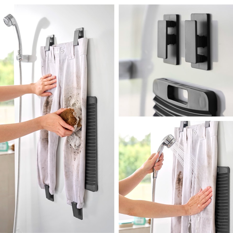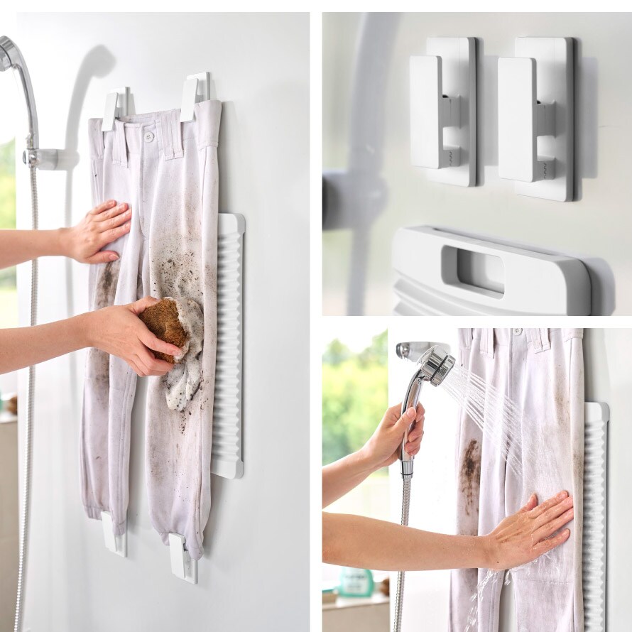 クリップで広げて貼り付け、擦り洗いができる洗濯板&クリップ。泥だらけのユニフォームを、ラクな姿勢でしっかり洗えます。
