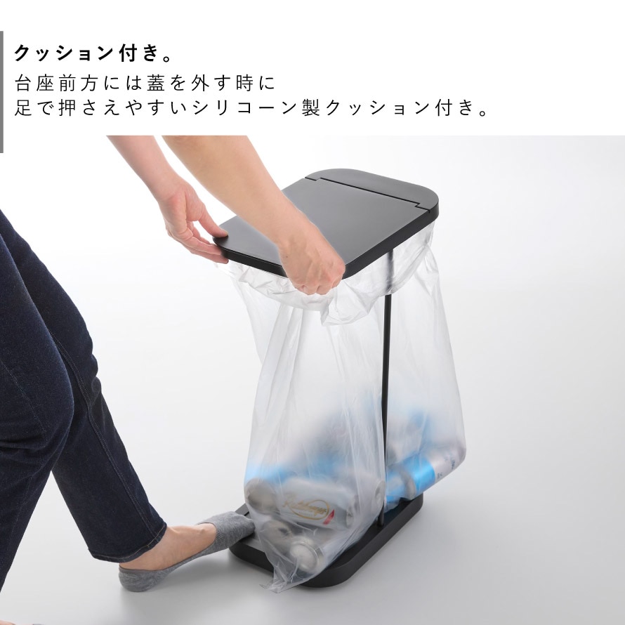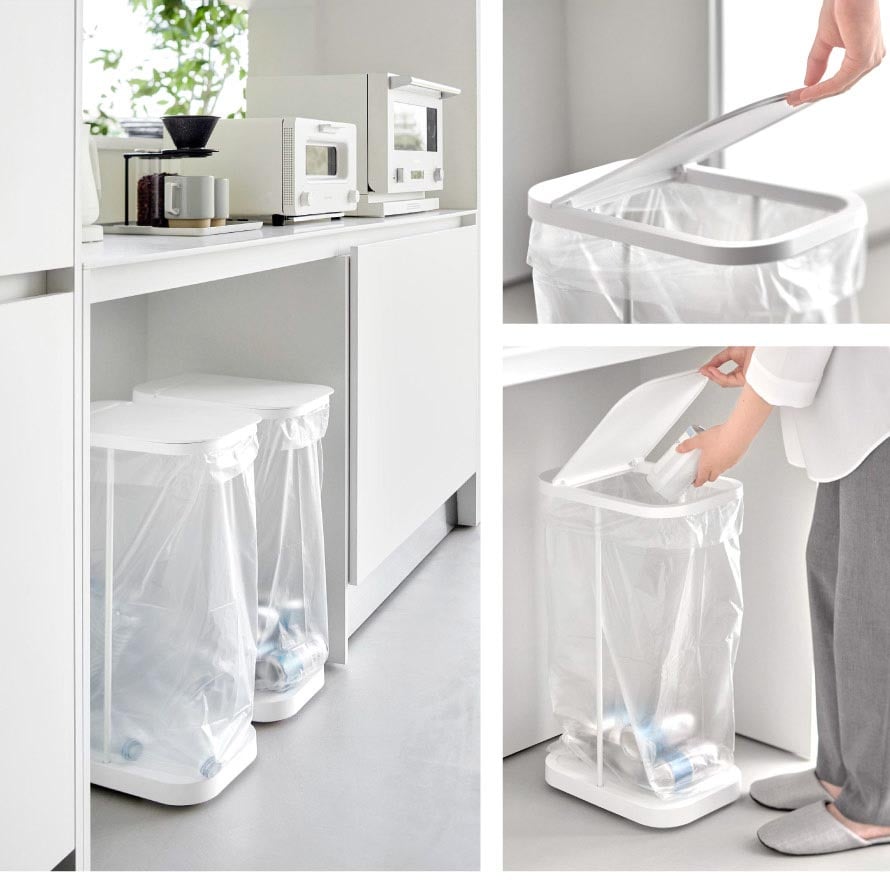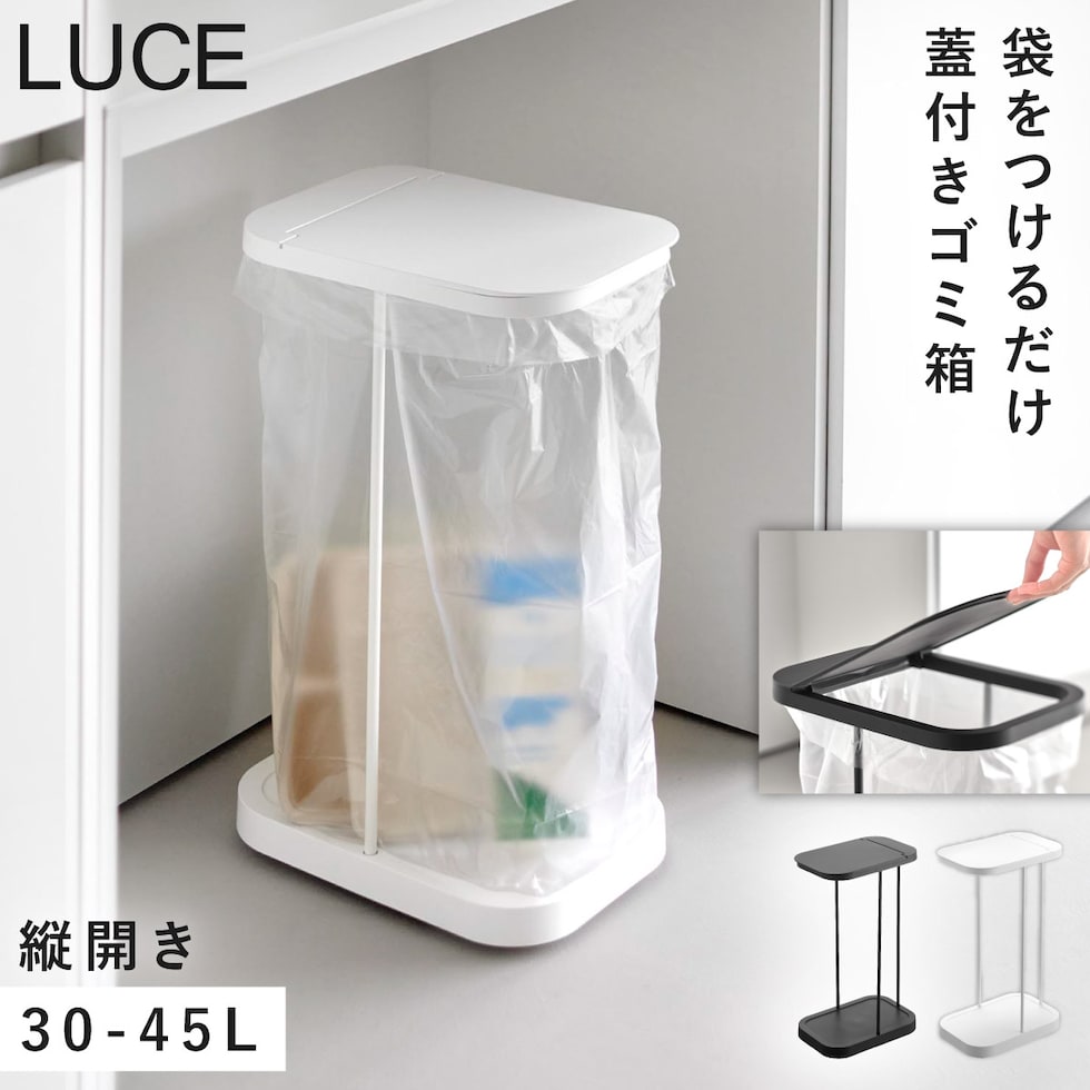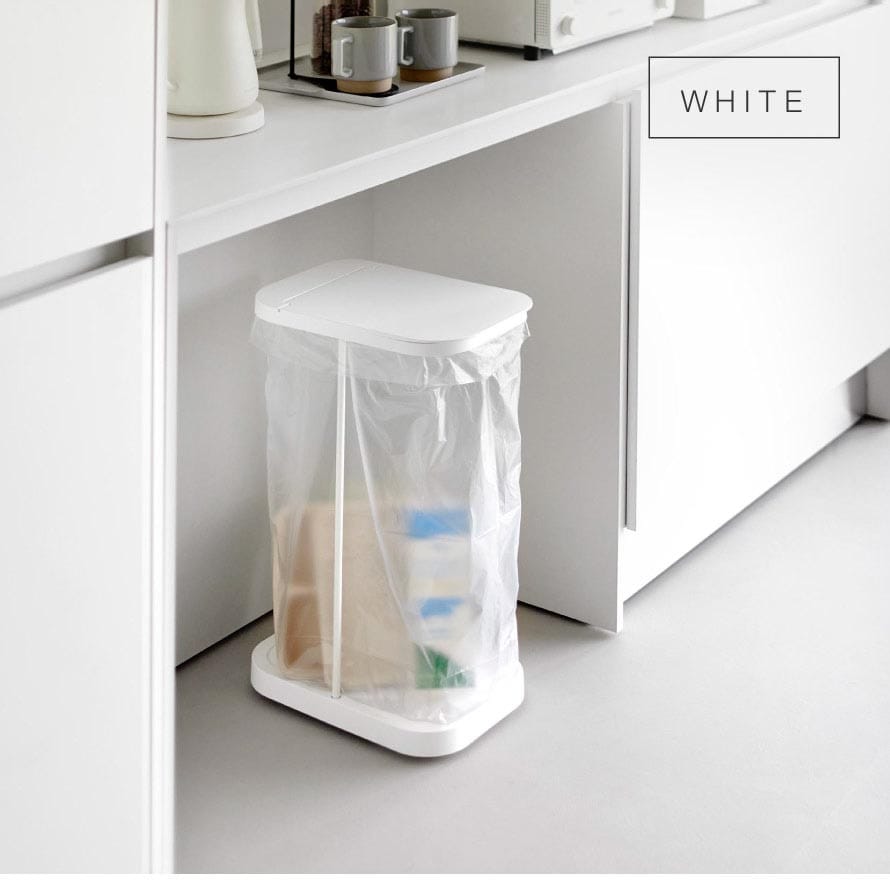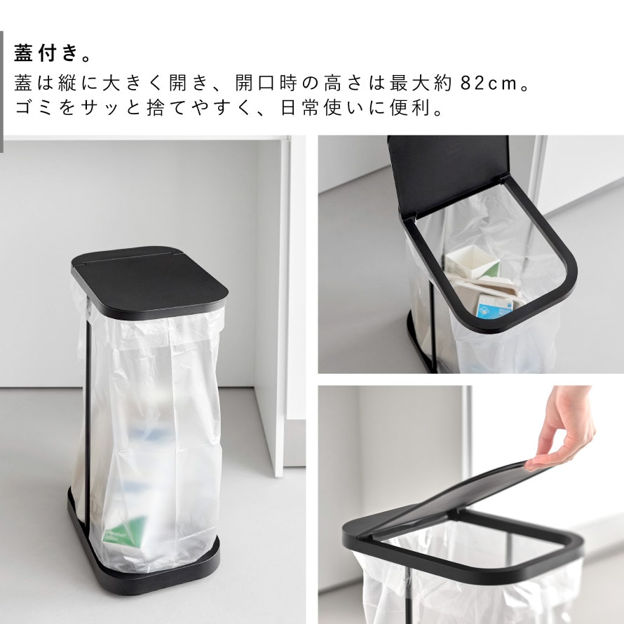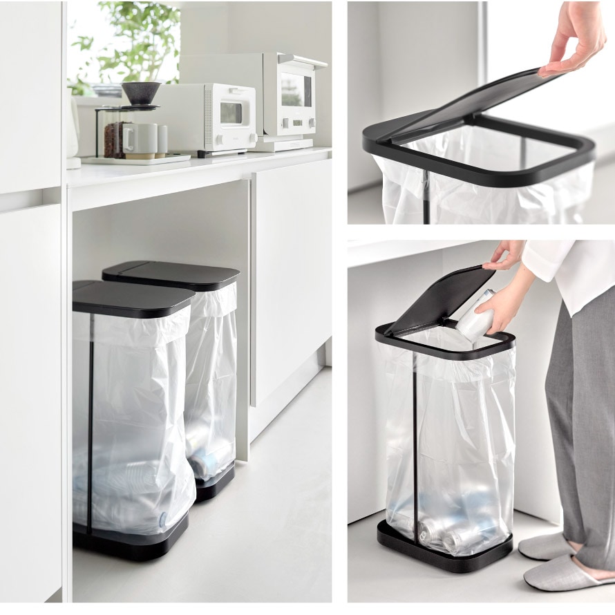 棚下にもすっきり収まる設計で、限られたスペースを有効活用。フレーム構造によりゴミ袋の容量を無駄なく使えるため、たっぷり入れられるのも特長です。30~45Lのゴミ袋対応です。