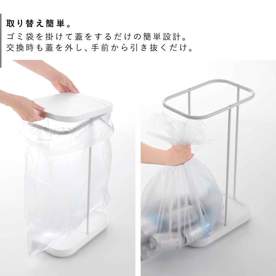 ゴミ袋の取り付けは、袋を掛けて蓋をするだけの簡単設計。交換時も蓋を外し、手前から引き抜くだけでラクに行えます。