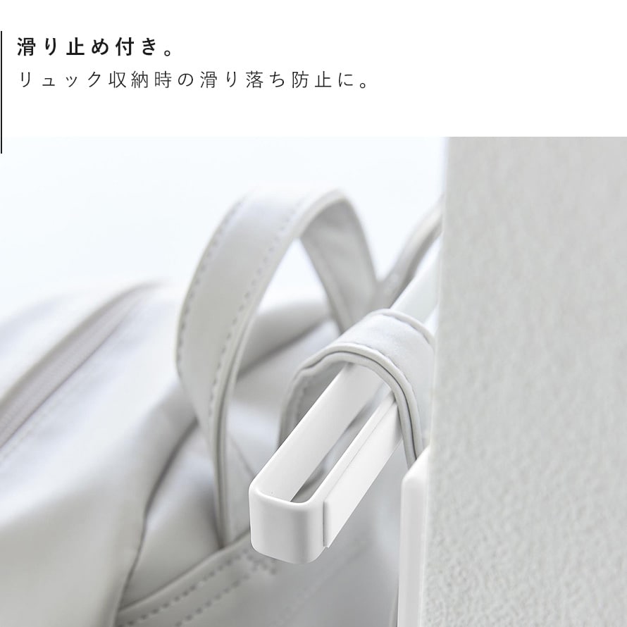 収納に困りがちなリュックを横に並べて掛けられ、手に取りやすい高さで省スペースに収納できます。