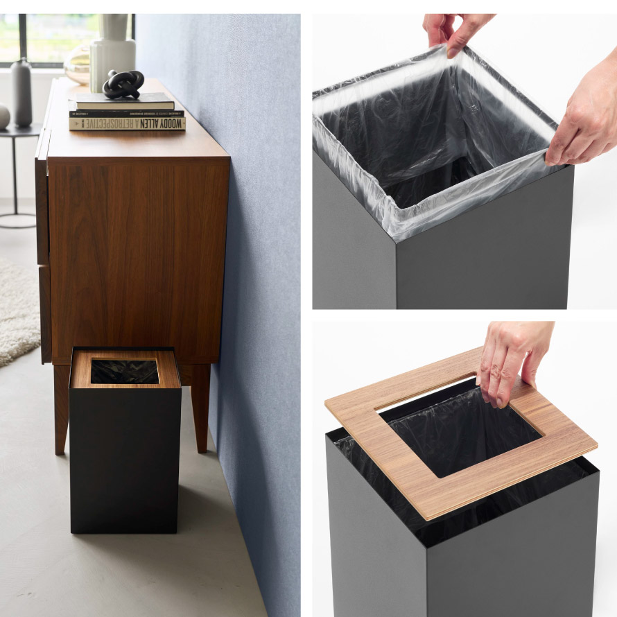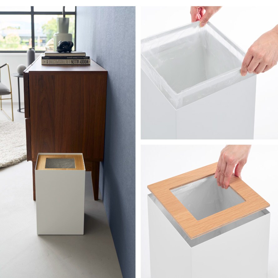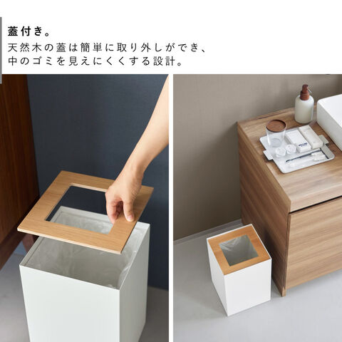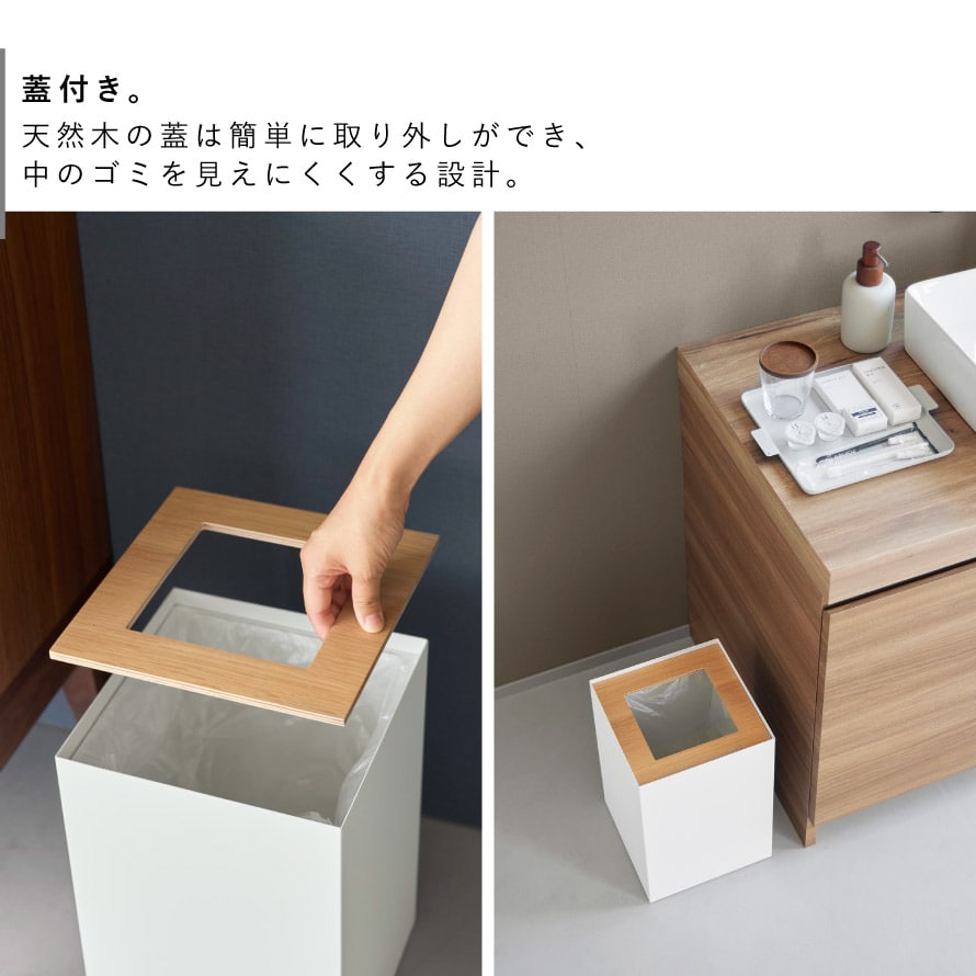 天然木の蓋は簡単に取り外しができ、中のゴミを見えにくくする設計。生活感を抑え、清潔で整った印象を保ちます。