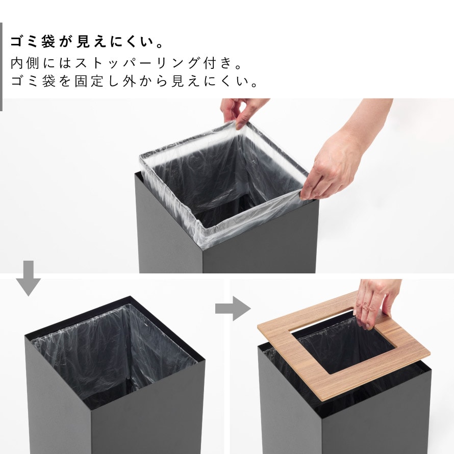 内側にはストッパーリング付きで、ゴミ袋をしっかり固定しながら外から見えにくく、すっきりとした見た目に。