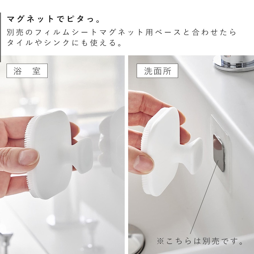 「フィルムシートマグネット用ベース タワー(別売)」を使用すれば、タイルなどの壁面にも収納可能です。