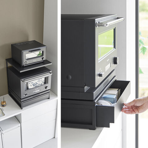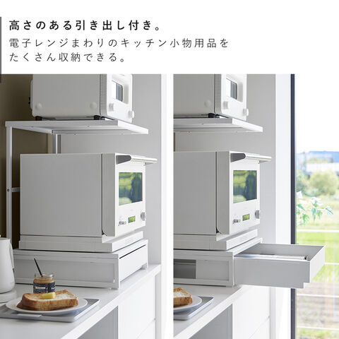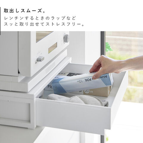高さのある引き出し付きで、電子レンジ周りのキッチン小物をたっぷり収納できます。