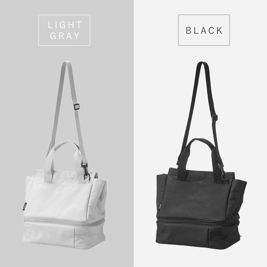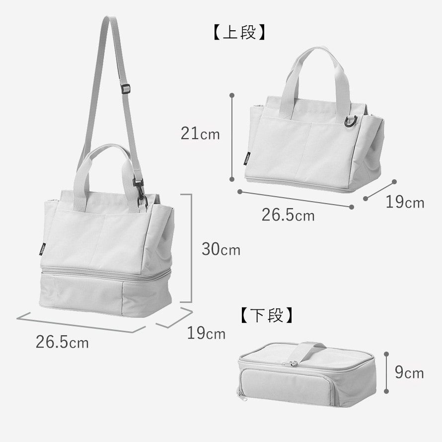 | サイズ | 幅26.5×奥行19×高さ30cm(持ち手・ショルダーストラップ含まず) バッグ(上段)/幅26.5×奥行19×高さ21cm バッグ(下段)/幅26.5×奥行19×高さ9cm ショルダーストラップの長さ/81~147cm |