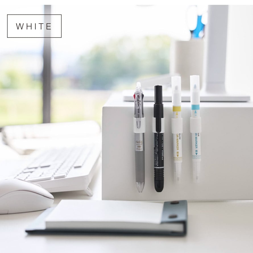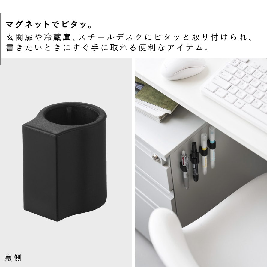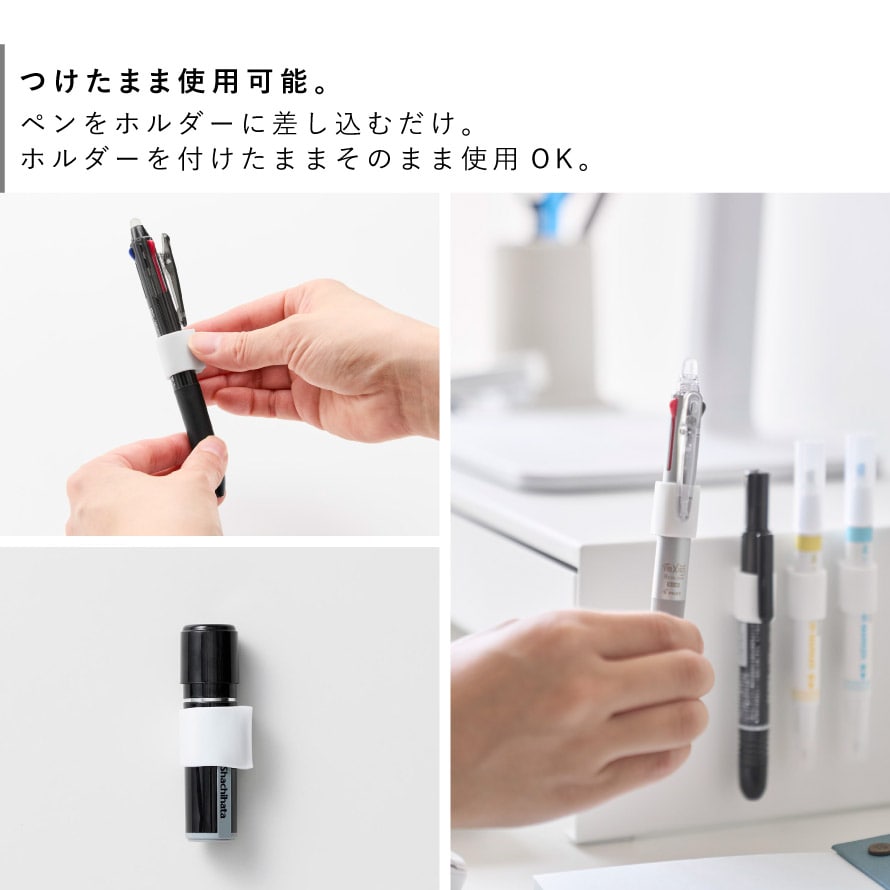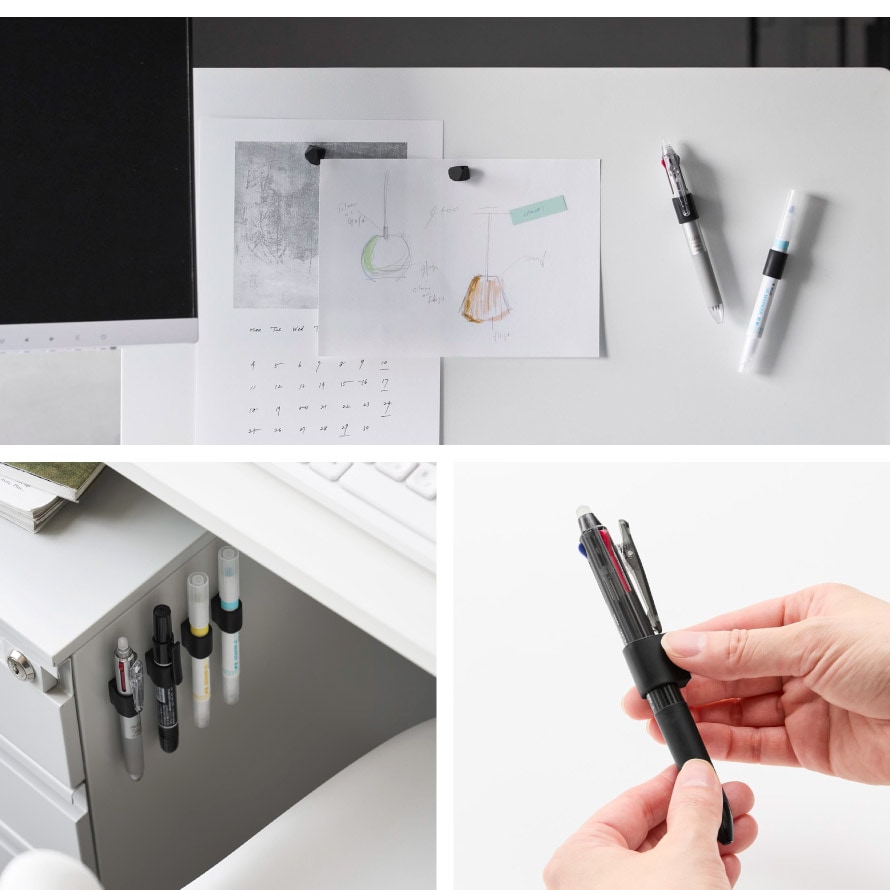玄関扉や冷蔵庫、スチールデスクなどにピタッと取り付けられ、書きたいときにすぐ手に取れる便利なアイテム。ペンにホルダーをはめるだけで簡単に装着でき、ホルダーを付けたままそのまま使用できます。