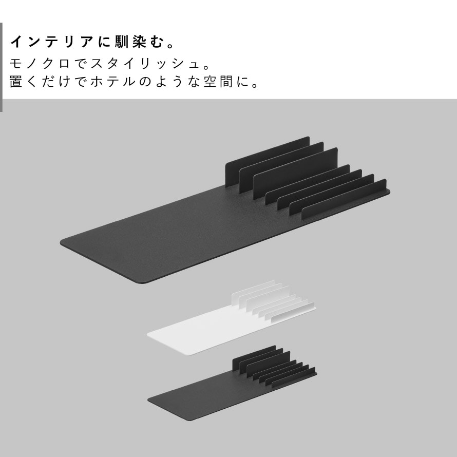 高さの違うスタンドで用途に合わせてすっきりと美しく収められます。スチール製ならではの程よい重みと安定感があり、上質な空間を演出します。