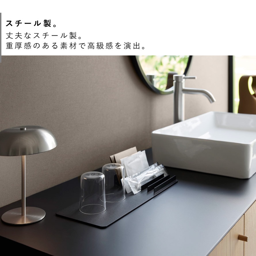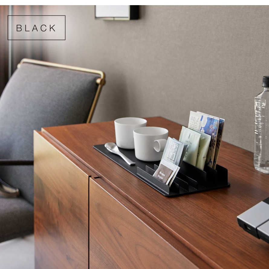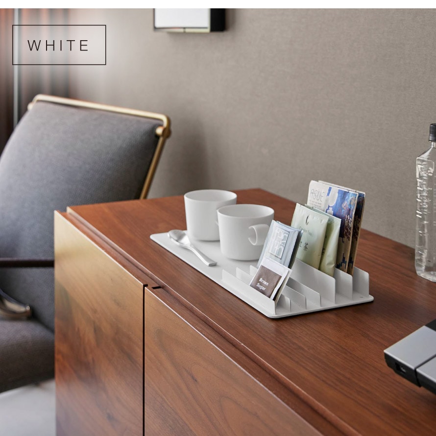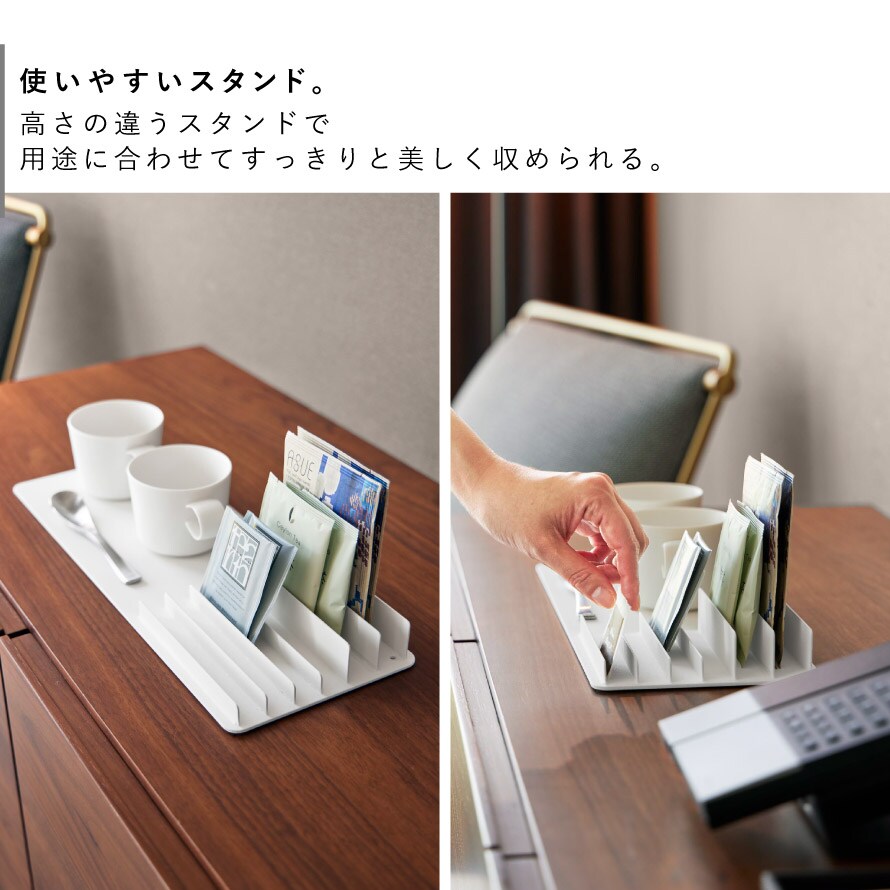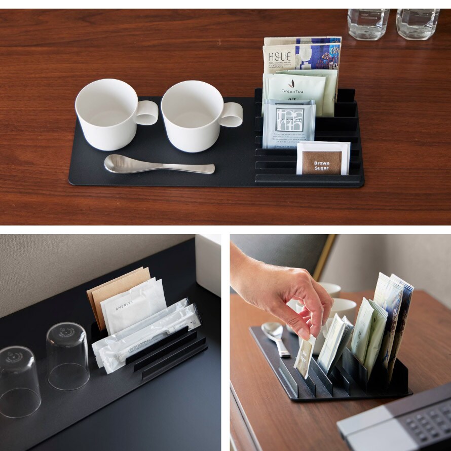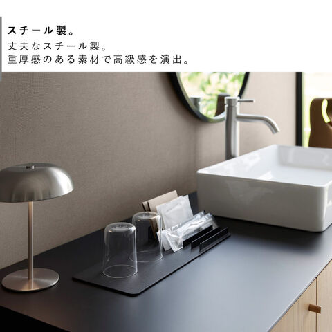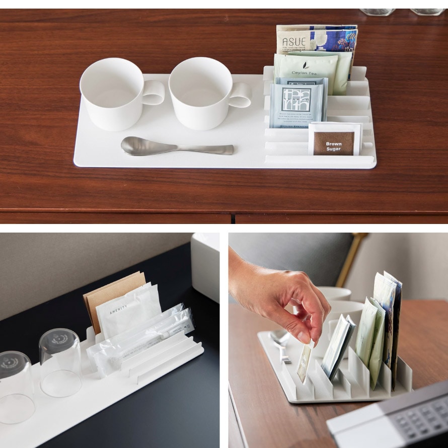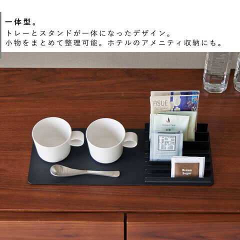 トレーとスタンドが一体になったデザインで、アメニティ類やドリンクのパック類など、まとめて整理可能。ホテルのアメニティグッズ収納にもおすすめ。