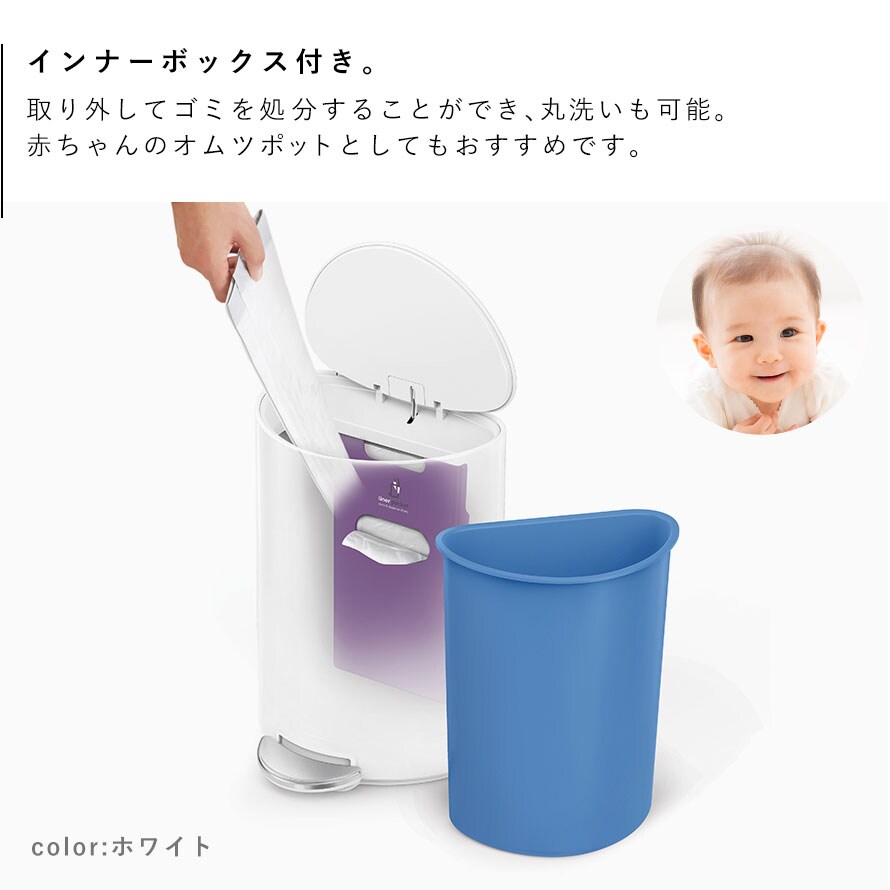 インナーボックスを取り外して、簡単にゴミの処分ができるので、赤ちゃんのオムツポットとしても重宝します。