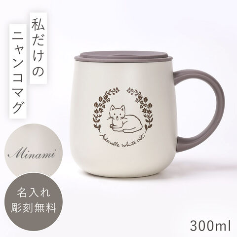 可愛らしいネコとイニシャルメッセージをあしらった、ほっと癒される蓋付きイニシャルマグです。