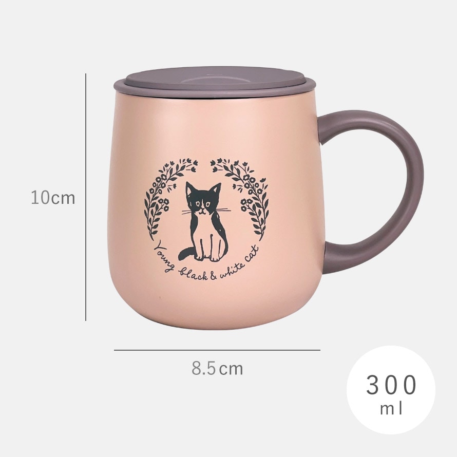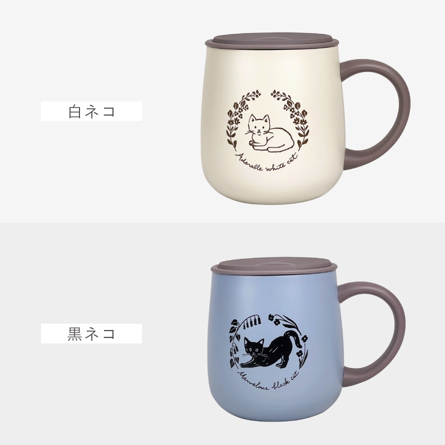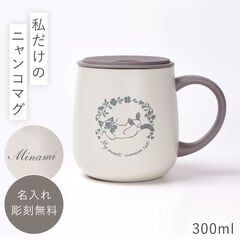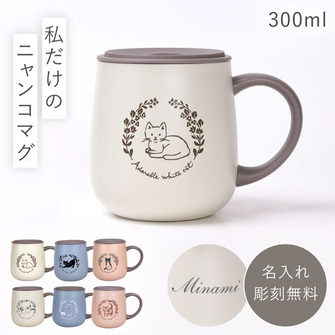 可愛らしいネコとイニシャルメッセージをあしらった、ほっと癒される蓋付きイニシャルマグです。