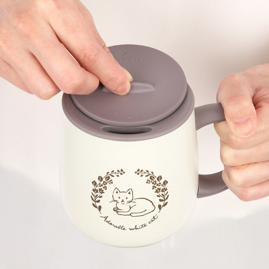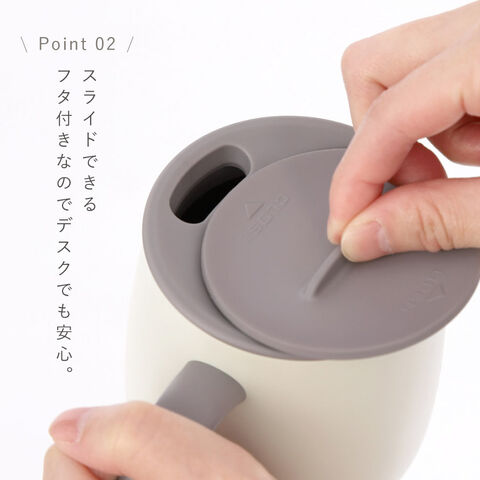 スライドできるフタ付き。ホコリを防いだり飲み物の温かさをキープできるのも嬉しいポイント。デスクワークや読書時間のお供にもおすすめです。片手で開け閉めできます。