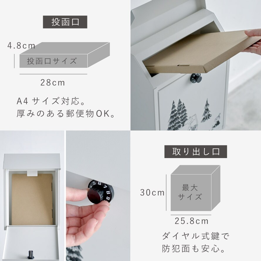 | サイズ | ポスト本体/幅31.8×奥行15.5×高さ42.5cm、ポスト投函口/幅28×高さ4.8cm、ポスト取出口/幅25.8×高さ30cm、ポスト用スタンド/幅38×奥行30×高さ65cm |