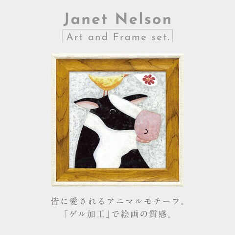 牛さんがニコッと微笑んで、頭の上には小鳥が歌を奏でている仕草。キュートなアニマルモチーフ。アメリカの女性作家ジャネット ネルソンのキュートな作品です。北欧インテリアにも合う、モダンなタッチがインテリアを素敵に演出します。