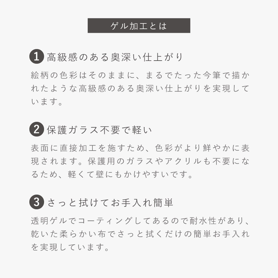 絵の表面を、特殊な透明ゲル(アクリルエマルジョン樹脂)を使って凹凸加工を施し、絵画のような質感を出しています。100%アクリル製の材質で、優れた柔軟性と耐水性があります。紫外線にも強く、油絵のように亀裂が生じたり、焼けて変色したりすることもありません。