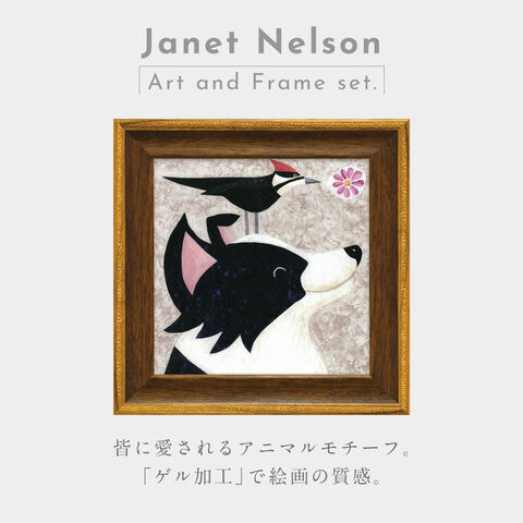 ワンちゃんがニコッと微笑んで、頭の上には小鳥が歌を奏でている仕草。キュートなアニマルモチーフ。アメリカの女性作家ジャネット ネルソンのキュートな作品です。北欧インテリアにも合う、モダンなタッチがインテリアを素敵に演出します。