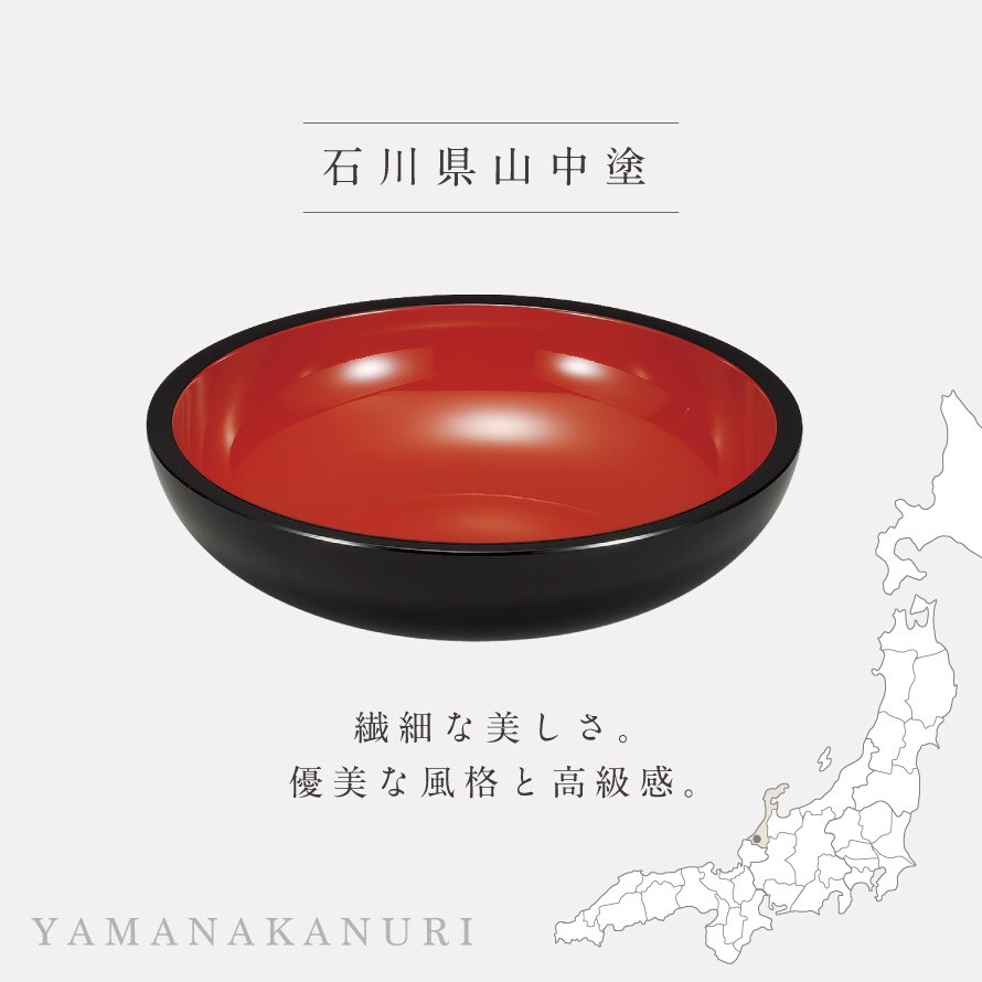 内側の朱色が艶やか。華やかにお料理を引き立てます。山中塗の美しさをより多くの方に感じて頂きたい逸品です。