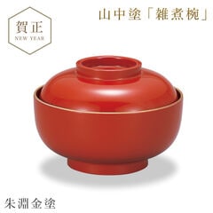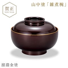 華やかさと艶やかな質感で、盛り付けたお料理を引き立てる、漆器の雑煮椀。金の縁取りが高級感を演出する、お祝いの席に合う和食器です。