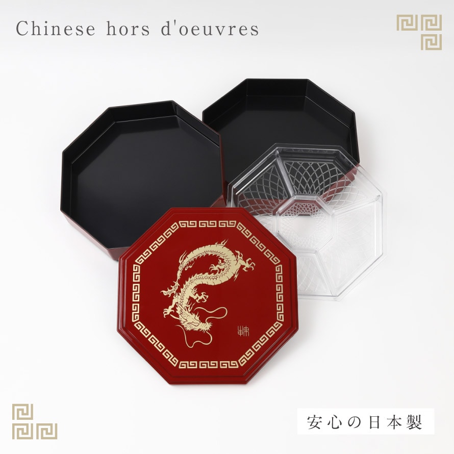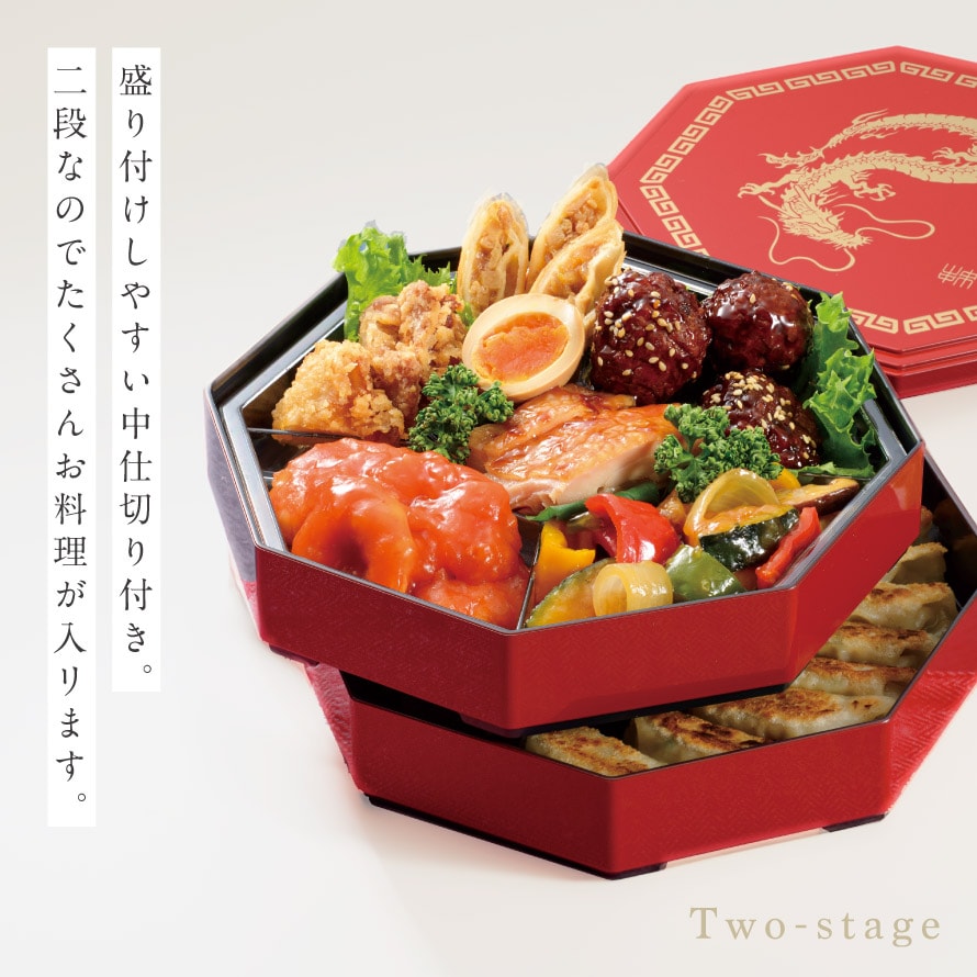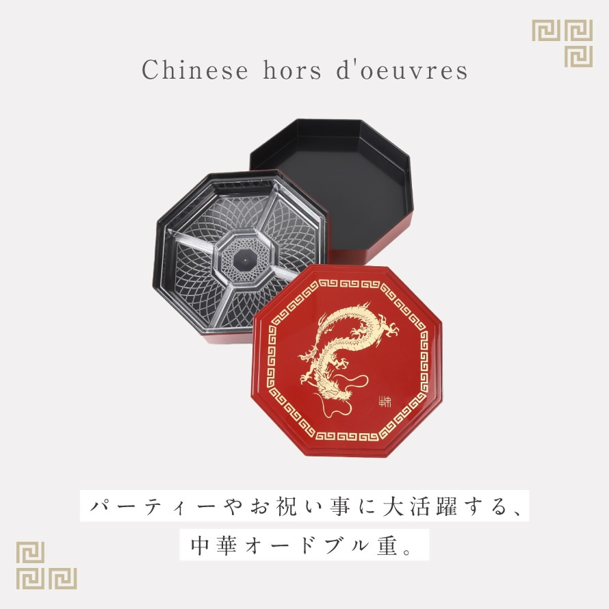仕切り付きで盛り付け簡単、中華料理のオードブルに。ホームパーティーや大人数が集まる催しにも大活躍する、中華オードブル重。お正月に中華オードブルのおせち料理にすると若い世代の方にも喜ばれます。