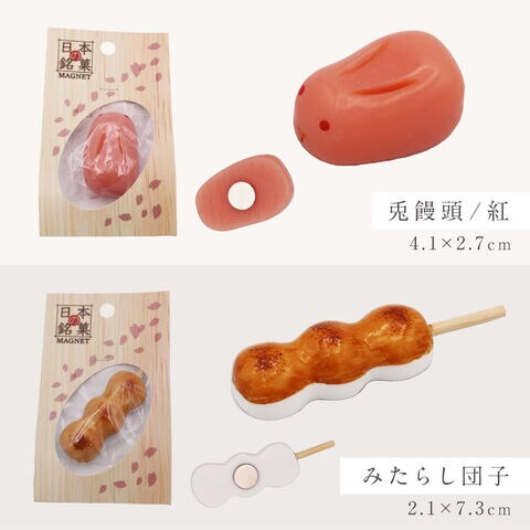 兎饅頭(白)/4.1×2.7×2.1cm、兎饅頭(紅)/4.1×2.7×2.1cm、みたらし団子/2.1×7.3×1.5cm、三色団子/2×7.7×1.5cm、たい焼き/3.1×4.8×1.2cm、梅饅頭/3.8×3.9×2.1cm、苺大福こし餡/3.3×3.7×2.1cm、苺大福白餡/3.3×3.7×2.1cm、生八橋ニッキ/3.1×5.7×0.9cm