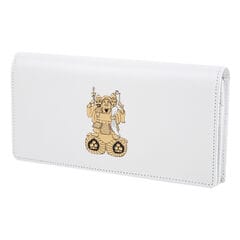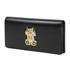 財布の中央に型押しされた三面大黒天が鮮やかに映える 招福・金運の神“大黒天”と、技芸・商売の神“弁財天”、さらに財宝・戦勝の神“毘沙門天が一つになった「三面大黒天」。