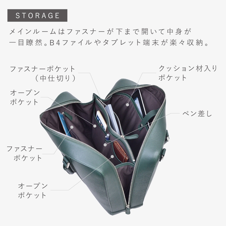 タブレットやノートパソコンの収納に便利なクッション材入りのポケットのほか、ファスナーポケット、オープンポケット2つにペン差しまで付いているので細かな荷物を整理収納しやすくなっています。